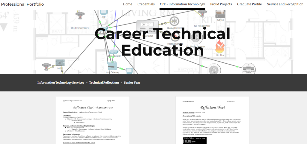 Portfolio Season is Here! March 31, 2026April 3, 2026 J Norton Senior students across campus are working hard on their Professional Portfolios and getting them ready to present in May prior to graduation. Click the image or link below to see a sample portfolio from an ITS student. https://sites.google.com/essextech.net/roisypena/home